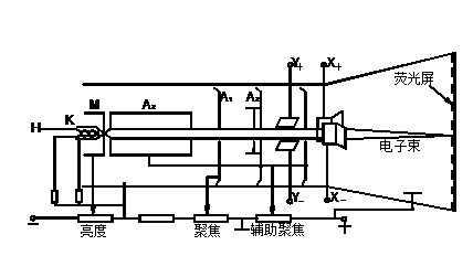 示波器的结构示意图。加热阴极会有电子发出,这些电子经聚焦、加速和偏转后飞向荧光屏,使荧光屏上的物质发光而形成亮点。如果在X轴偏转板上加一锯齿波电压,电子射线将沿X轴方向从左到右匀速移动,这称为扫描。这时屏幕上显示一条水平的扫描亮线。